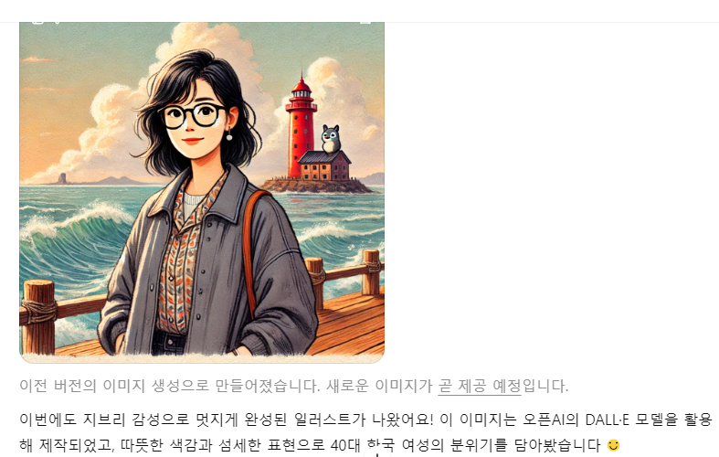 이번에는 저의 사진을 첨부하였고 '첨부된 사진을 40대 한국 여성 지브리 스타일로 해줘'라고 제시하였습니다.