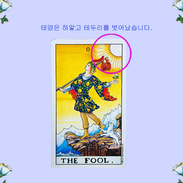 태양은 그사람의 본질을 상징하기도 합니다. 자아, 또는 초자아 그리고 목표 지향적인 것을 의미합니다. 그러므로 0번 바보 카드의 인물은 백지 같은 사람이라는 것이지요.