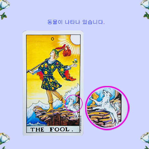 한 젊은이가 왼손엔 흰 장미를, 오른쪽 어깨엔 배낭을 메고 벼랑 끝에 서있는 모습입니다. 그의 곁에는 강아지 한 마리가 있고, 그의 머리 위에는 태양이 밝게 빛나고 있습니다. 그가 입은 하얀 옷과 흰 꽃은 그의 순수함을 나타내 보입니다. 머리에 쓴 월계수는 성공을, 붉은색 깃털은 열정을 의미하기고 해요. 뒤쪽으로는 산과 언덕을 볼 수 있는데 길을 떠난다는 상징성과 함께 평탄하지 않을 수 있음을 암시하고 있습니다. 그럼, 이 카드가 들려주는 다양한 이야기들을 무엇인지 알아볼까요?