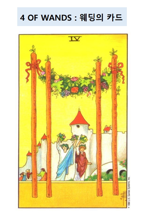 그 아래로 두 명의 여인이 3개의 꽃다발을 머리 위로 올려서 누군가를 환영하는 것 같으며 갈색옷의 여인은 안전을 수호하는 여신이고, 푸른 옷의 여인은 평화의 수호를 상징하는 여신인 듯해요. 숫자 4는 안정과 번영을 상징하며 네 개의 지팡이는 노동으로 수확한 후의 축하 파티를 상징합니다. 또한 지팡이 4번 카드는 '행복한 귀향'이라 부르기도 하고 재결합을 준비할 때 나타나는 경우가 많으므로 동반자나 가족의 재결합일 수도 있고, 또는 휴가나 휴식을 위한 때를 나타낼 수도 있어요.