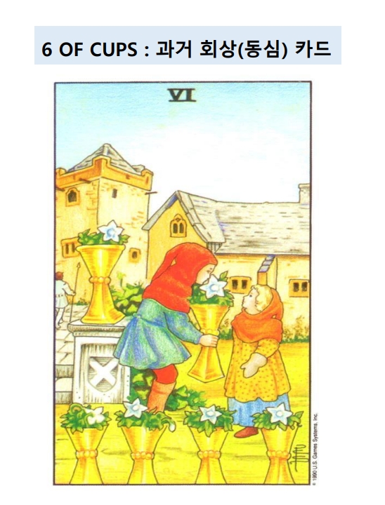 six of cups 카드는 옛 애인을 다시 만나거나, 어릴 적부터 알던 사람이나, 또는 오래전부터 알던 어떤 특별한 사람이 우리 삶 속으로 다시 들어오는 것을 상징하는 경우가 많아요. 현재 진행되고 있는 관계이기도 하고 과거에 강한 뿌리를 가진 관계를 가리키기도 합니다.